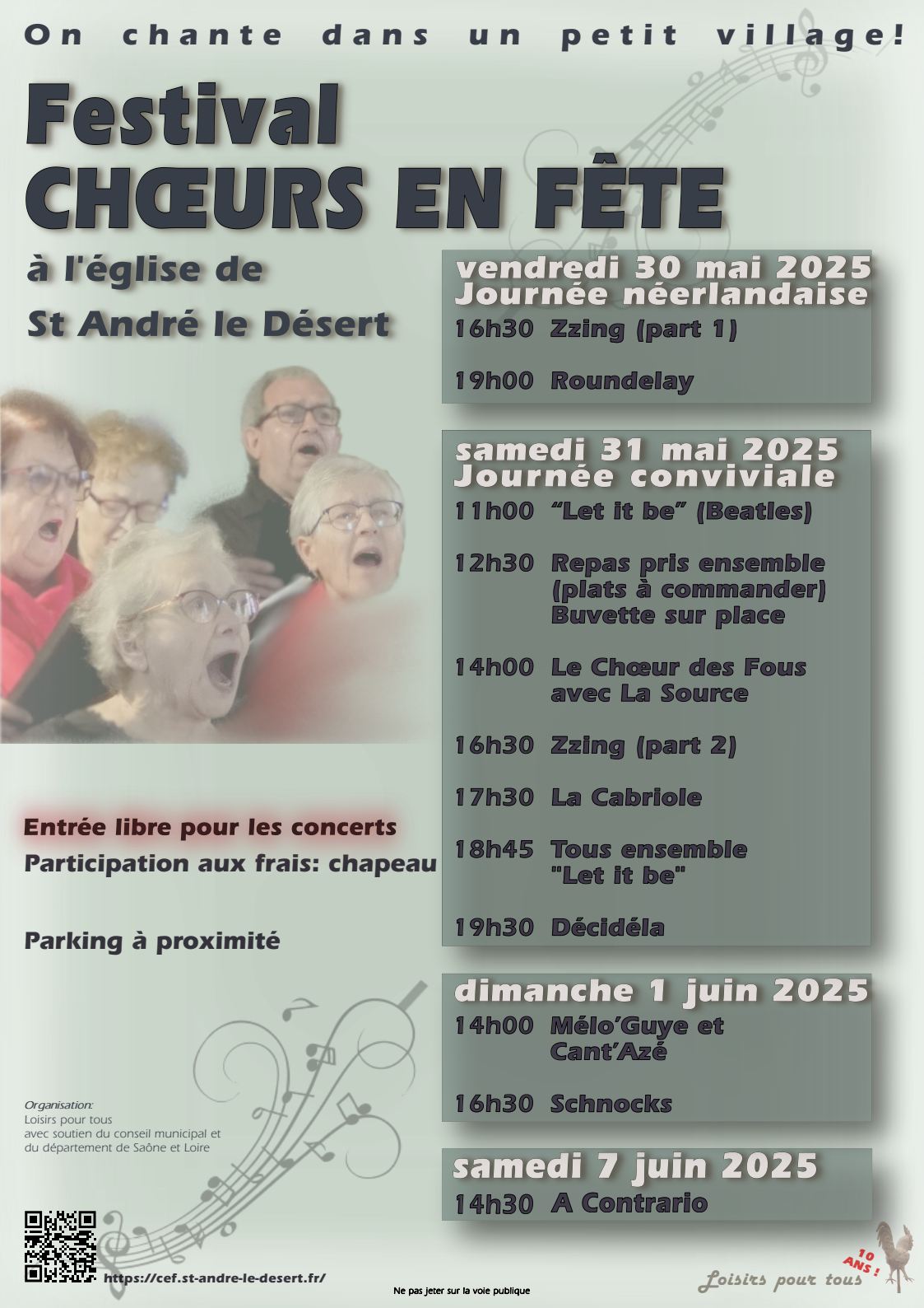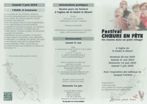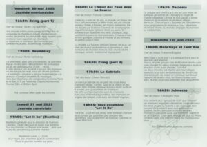 Documents et téléchargements Les documentsCes documents ont été préparés avec soin. Il peut y avoir des modifications par rapport aux publications précédentes de ces documents. Les documents peuvent être utilisés et distribués. Téléchargements AperçuLienDernière modificationCréateur / auteur 1Affiche Festival chœurs en fête 202521-5-2025Ruud Baart 2Flyer intérieur Festival chœurs en fête 202517-4-2025Ruud Baart 3Flyer extérieur Festival chœurs en fête 202522-4-2025Ruud Baart 4Banderole 2024mai 2024Ruud Baart 5Partition "Let it Be"30-3-2025Joram Cay Bohëme Programmation